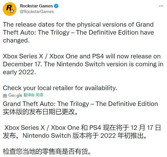 也许是受到游戏质量的影响,Rockstar已经通过官方社交媒体宣布,主机版《GTA:三部曲-终极版》无法按原计划在12月7日推出,PS和Xbox版的实体光盘将延期十天,而Switch的卡带版本则需要等到2022年。