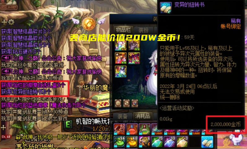 相比较第8季阿拉德探险记,“编年史”中的变异扭转书,用途灵活了起来。以前送的变异扭转书,要是角色没有用,就会坐等在仓库过期。但这次就不同,能丢商店里面,换取200W金币,让玩家始料未及。