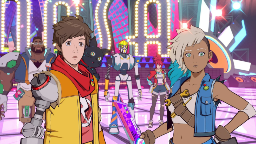《完美音浪》从一开始就展现了它对当代车库音乐和另类摇滚的敬意,以黑键乐队的《Lonely Boy》为开场乐,为玩家介绍了随性但讨人喜欢的主角阿茶,并引入了他所生活的色彩斑斓、科技尖端的工业化世界观。在一次手术事故中,他的随身听被封进了胸口里,因此他被机器人产业巨头范德雷科技公司贴上了「瑕疵品」的标签,他可以看到并感受到他的音乐在自己周遭环境中的律动。这位孩子气的愣头小子当即临时拼凑出一把形似吉普森 Flying V 吉他的大剑,对着那几个范德雷机器人就是一顿猛砍,从那一刻起,几乎所有的一切都与《完美音浪》的配乐节奏紧密联系。