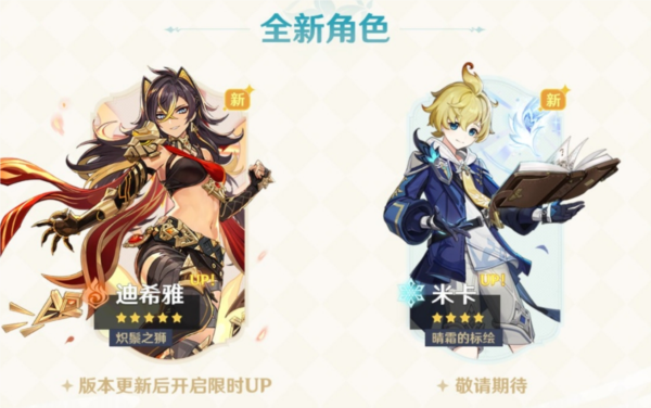 在新版中全新五星角色「炽鬃之狮・迪希雅 (火)」,全新四星角色「晴霜的标绘・米卡 (冰)」将加入游戏。有关旅行者双子的魔神任务「卡利贝尔」将会在 3.5 版本开放。全新限定五星双手剑「苇海信标」也将在 3.5 版本上线。