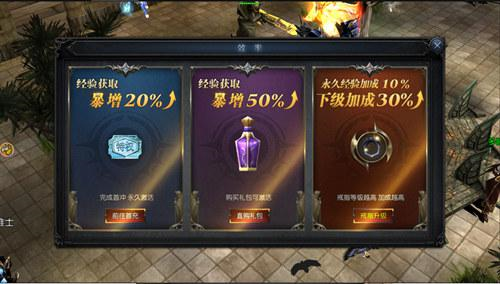 (2)在前期购买首充礼包、每日礼包经验药水,以及进行戒指升级,加上赠送的经验加成,可以在前期获取经验优势,越早购买越好。