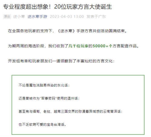 近日,网易旗舰武侠开放世界《逆水寒》手游筹备半月之久的方言共创活动告一段落,官方总结了来自15个不同省份地区的几千位玩家提供的,多达50000+的方言配音作品,包括温州话、台湾话、东北话、云南普洱话等等。