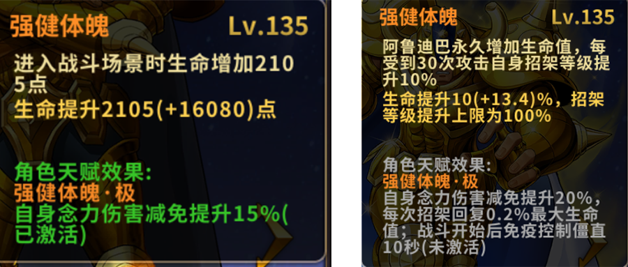 最后,技能触发的阈值也在升华后提高了,从之前的35%到现在的50%,大幅度提高的防御、招架等级的数值,让升华·阿鲁迪巴在一半血的时候就可以极大提高生存能力。另外,致命反击的效果从之前的15秒缩减为4秒,伤害也能得到一个可观的提升,让其能在快节奏的现版本下战斗使用。