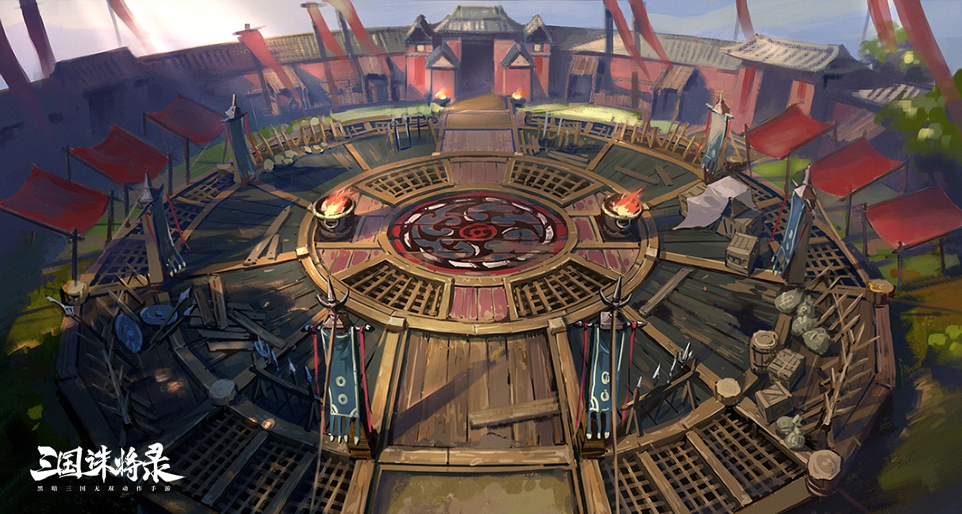 这边比武场中,旌旗在风中飘扬,颇有金戈肃杀之感。圆形木质擂台居于其间,其下火光微现,不禁让人沉思若是战败掉落而下会是怎样的光景。台上台下仅留一道而行,压迫感十足,望台上战火已燃,别有一腔孤勇热血欲喷薄而出。不知是哪两位勇士,会走进这方天地一争高下呢?
