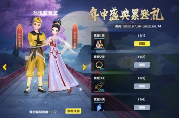 7月30日-8月14日,登录送好礼,只要累计登录,即有多重福利等你拿!更有重头戏孙悟空/霓裳仙子动作套装等你领!穿上帅气金甲,征战西天,除魔卫道!