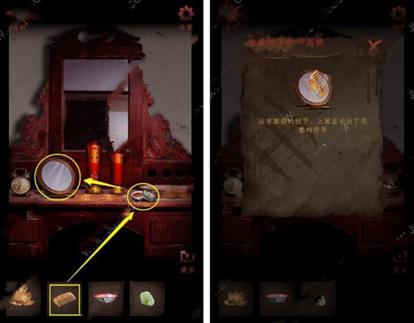 6、我们用梳子对胭脂使用,再放到镜子上即可获得线索。