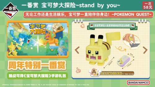 在这次万代一番赏的联动活动中,《宝可梦大探险》也不负重托推出了多个赏品,以后的日子里,探险家们可以和宝可梦们0距离接触,一起在大陆上探险。探险家们的寻宝之旅也不再孤独。