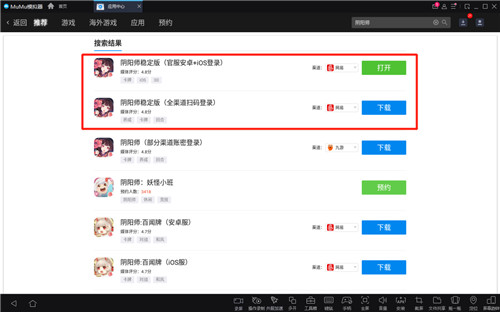 第二步:在MuMu模拟器搜索“阴阳师”,点击“阴阳师稳定版”下载对应的官服或者渠道服,等待下载安装即可