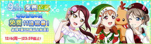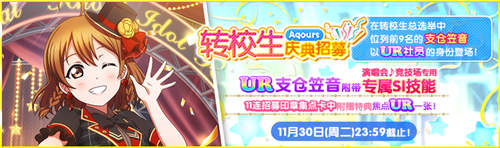 11月25日更新后至11月30日将开始转校生庆典招募,本次招募分为μ’s和Aqours两种,支仓笠音以UR社员的身份登场!本次招募中登场的UR支仓笠音以下内容未进行实装:引导员语音及支线剧情