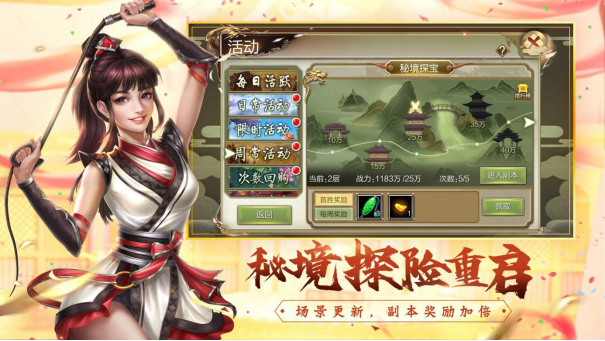 万众期盼的秘境探险全新改版重启,全新美化的界面和加量的丰厚奖励;积分商店取消,首胜奖励再度袭来,力争上游,全力通关;周常奖励天龙通宝上架,相约秘境探险,奖励加量不加价!侠士们快奔走相告!