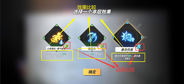 属性增益在每次挑战之前,都可以选择跨层增益/本层增益,具体的效果选择可看效果增益情况和品质决定,同时选择的时候也要搭配一下伙伴选择;