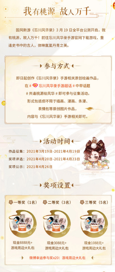 风华相遇,桃源相会!《忘川风华录》手游全平台公测已经开启,同人创作活动也已风华开赛,静待各位玩家“使君”前来共逢桃源绘风华!