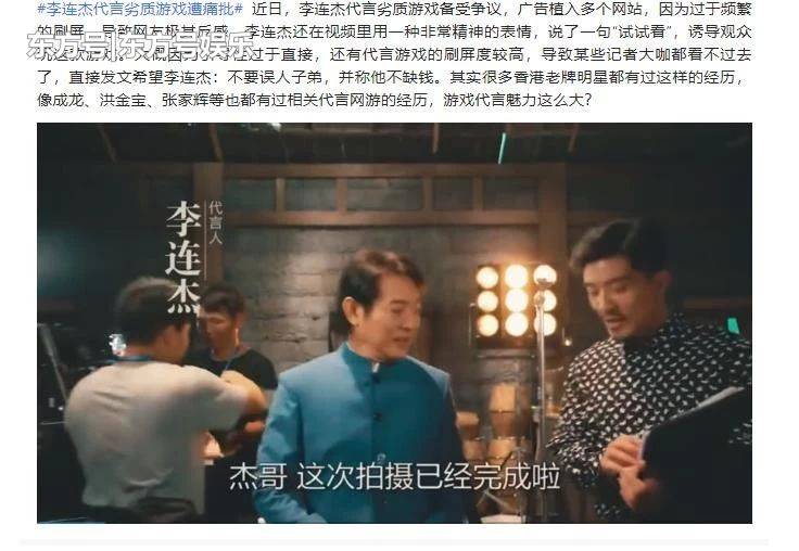 8月22日有网友发文称李连杰代言的劣质游戏最近一段时间备受争议,游戏的广告植入多个网站而且由于过于频繁地刷屏,导致网友极其反感。