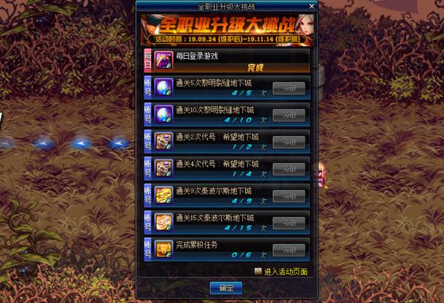 全职业预约升级大挑战活动,玩家满级即可拿到5件期限的泰波尔斯史诗防具,1把苍穹幕落武器同样是30天的,但是玩家可以在后续的挑战任务中完成对应的任务拿到永久升级券。通关9次泰波尔斯拿到武器升级券,15次拿到2张泰波尔斯永久升级券,完成全部任务可以拿到终极奖励3张泰波尔斯永久升级券或者自选1200个苍穹碎片。