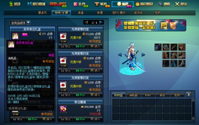 商城道具新增777点券的一个吉祥幸运礼盒,打开获得1个耀银品级调整和20张幸运礼盒随机转换券,以及随机获得末吉到到大吉的强化、增幅、装扮、徽章幸运礼盒1个。