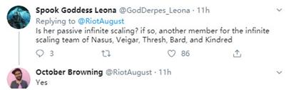 在回应玩家关于赛娜的被动技能是无限叠加的问题中,设计师给出了肯定的回答,那也就表明赛娜将会是继小法、锤石、千珏等几个英雄之后的另一个有着无限成长潜力的英雄。
