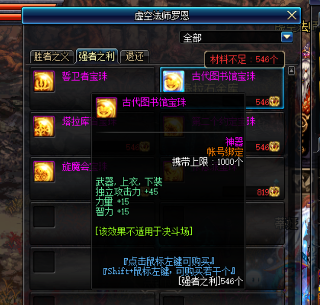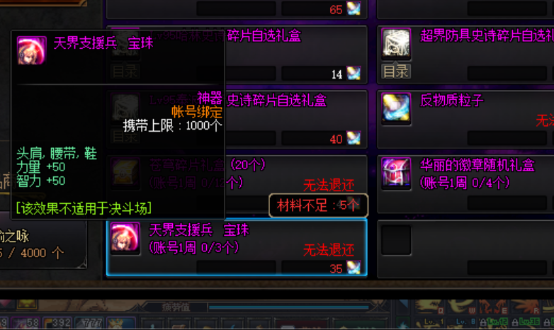 第一个就是攻坚商店中的宝珠,在周年庆改版以后,攻坚商店中的漩涡商店就新增了一个宝珠,天界支援兵宝珠。这个宝珠可以增加50点力量和智力,附魔的位置是护肩腰带和鞋子。这个宝珠的出现,完美解决了平民玩家没有节日附魔的烦恼,而且总共增加150点四维。面板又好看,又有的加强,兑换一个只需要35个反物质粒子,一周可以兑换3个。
