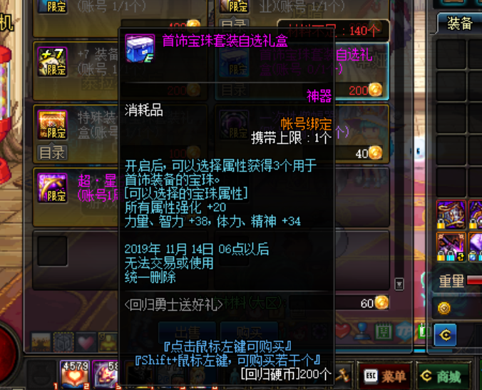 第二个就是最近活动中赠送的附魔了,这个就是回归商店。回归硬币大家很熟悉,一年会出好几次召集回归玩家的活动。这次活动比以前门槛都低了不少,只要跟回归玩家一起组队刷推荐图或者是打团,都可以获得回归硬币,一天获得的上限是50个。回归商店中的附魔基本可以让你达到普雷门槛,兑换的首饰附魔,输出职业3个增加20属强的宝珠,辅助职业增加四维的宝珠。还有特殊装备的附魔也有赠送,虽然不是完美,但是用来过渡也是足够了。