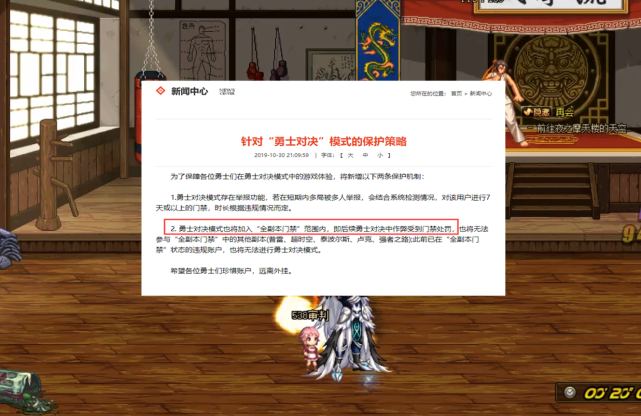 在勇士对决模式出来后,官方为了建立良好的游戏环境,让玩家在新模式中有更好的游戏体验,就做出了保护策略,在官网发布消息,凡是在勇士对决模式中作弊的玩家,一经发现将受到全部副本门禁的处罚!