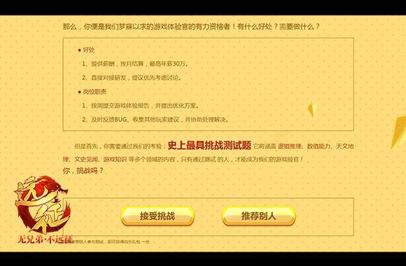 我们将打破传统的招聘环节,简单粗暴的只有一道程序,你只需通过我们的“史上最具挑战测试题”考验,它将涵盖逻辑推理、数值能力、天文地理、文史见闻等多个领域,全面考察你的能力哦,只有通过我们的测试才能成功当上游戏体验官,坐拥年薪30万,你敢来挑战吗?