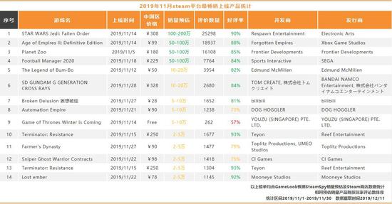 根据steamSpy数据,2019年11月Steam平台共计上线822款游戏,虽然只有9款产品的销量超过了5万套,但是头部产品有4款突破50万销量,排名第一的《STAR WARS Jedi: Fallen Order》更是在30天内突破百万套销量。