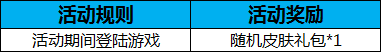 活动规则:登陆新大厅即可获得随机皮肤礼包*1!仅可领取一次。