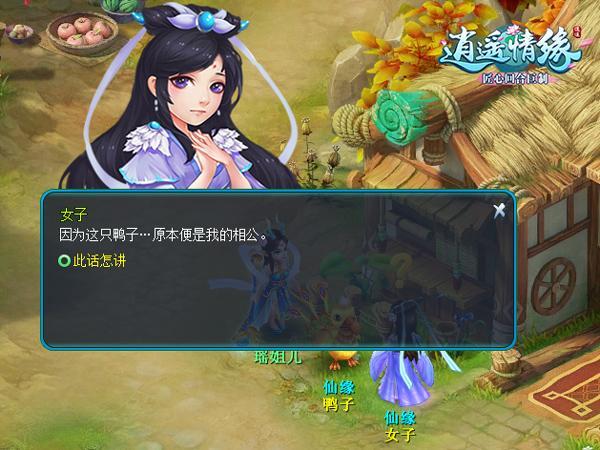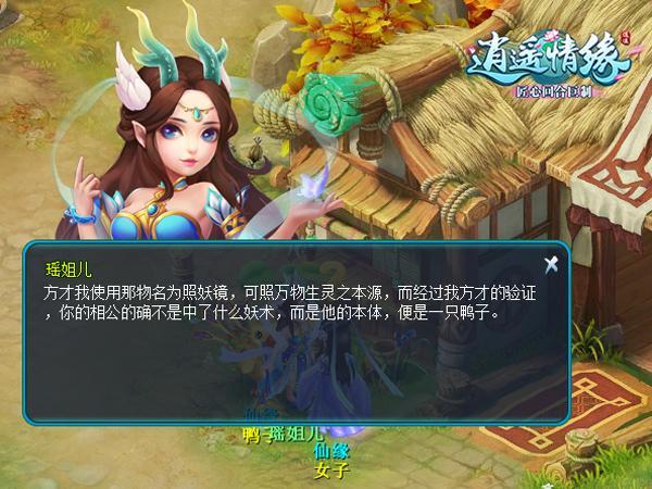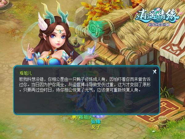 有一天,瑶瑶在路上偶遇一个小和尚,才交谈了几句,就被带去昆仑山一处茅草屋下,恍惚之中,听得一女子轻声呼唤——相公,相公。瑶瑶一看,周围并没什么人,难道,叫的是我?虽然妹子美丽动人,但瑶瑶暂时还没有搞姬的打算。待瑶瑶清醒一下,发现妹子对面还站着一只小黄鸭,看这姿势,难道那声相公是对着鸭子说的?瑶瑶立马上前询问一番。