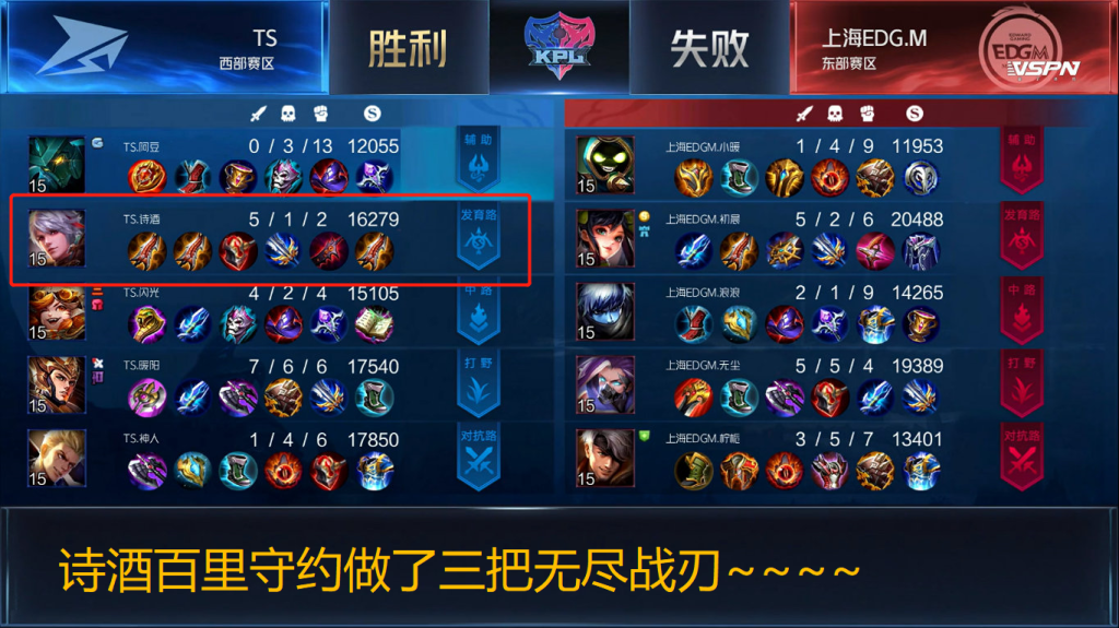 双方都没有任何的积分压力,而且比赛的结果也不会对其他战队的排名产生任何的影响。所以TS直接就放飞自我,拿出各种新奇的东西玩起来了,EDGM也被他们带偏了,连“吉吉国王”都拿出来了。而最终TS也以3比2的比分战胜了EDGM。不过小伙伴们是否有注意到诗酒百里守约的出装,着实“脑洞大开”啊!怎么一回事呢?咱们接着往下聊!