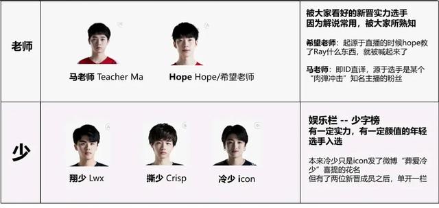 在LPL现役选手中,“老师”辈的选手有两人,分别是马老师和Hope老师。被称为“老师”辈的选手,都是被大家看好的新晋实力选手,因为被解说常用,所以被大家所熟知。而“少”字辈的选手有三人,分别是翔少、撕少和冷少!