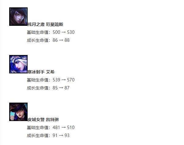 最后就是射手改动啦,大部分射手英雄都获得了30点血量加成,以及2点成长生命值加成的改动。虽然对滚起来雪球的刺客来说还是行走的三百块,但是现在能适当有一些还手的能力了。