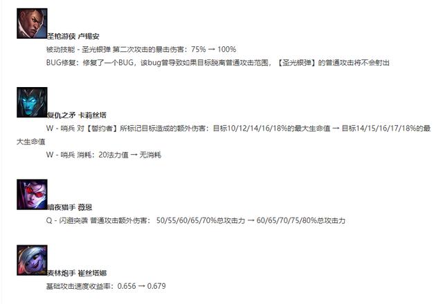 四位没有获得改动的,也获得了相对应的改动,其中卢锡安的改动最为关键,被动暴击能直接打满伤害了,100%的暴击伤害,现在卢锡安也基本上是破败之后转暴击,这对于卢锡安来说帮助还是很大的。接下来的版本相信穿甲就不会再是主流出装了。