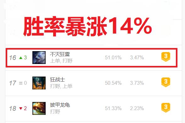 设计师当然不想看到这样的局面。在连续三次加强后,打野狗熊胜率暴涨,从38.2%一路升到51.01%。虽然在打野还是T3队列,但是比之前的倒数第一还是好了不少。而且设计师明说了,狗熊就是个打野,不适合上单,也证实了上单狗熊的不可行。