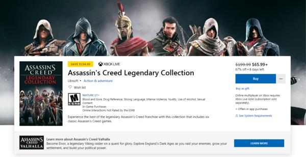 该捆绑包共收录了近几年来的六部《刺客信条》系列游戏,包括《刺客信条:黑旗》、《刺客信条:大革命》、《刺客信条:叛变 高清版》、《刺客信条:枭雄》、《刺客信条:起源》、《刺客信条:奥德赛》,售价59.99/65.99美元。