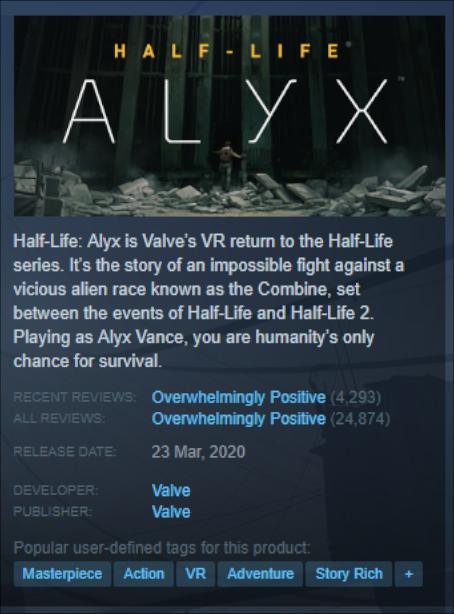 半条命:Alyx带来了VR头显带来的Steam用户所占百分比从1.29%增加到1.91%。 UploadVR.com对此很热心-我不太相信。 在这款游戏中,Steam上的评论获得压倒性好评,截至撰写本文时,评论总数不到25,000。 这场比赛的接待令人赞叹。 那么,为什么没有启用更多的单位呢? 《半条命》可能是与Steam一起成长的PC游戏玩家的圣经。 需求肯定在那里。 它应该可以转化为更多的销售额,但事实并非如此。