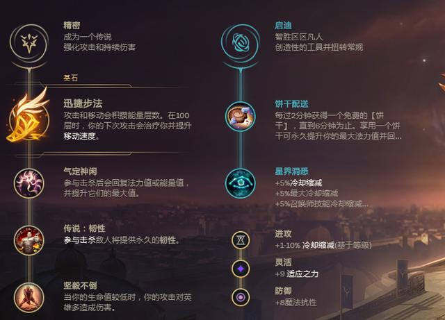 而之所以选择迅捷步伐,因为塞拉斯需要清线,所以技能只能主Q副W为主,这样导致线上的续航能力降低,其次加上中路兵线路程较短,对手又一般是远程法师,所以选择征服者的难度会变高。