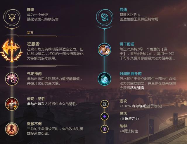 其次在线上对拼中,【破敌禁法】还能增加额外魔法伤害,搭配符文征服者可以弥补塞拉斯前期连招间隔期的平A伤害。