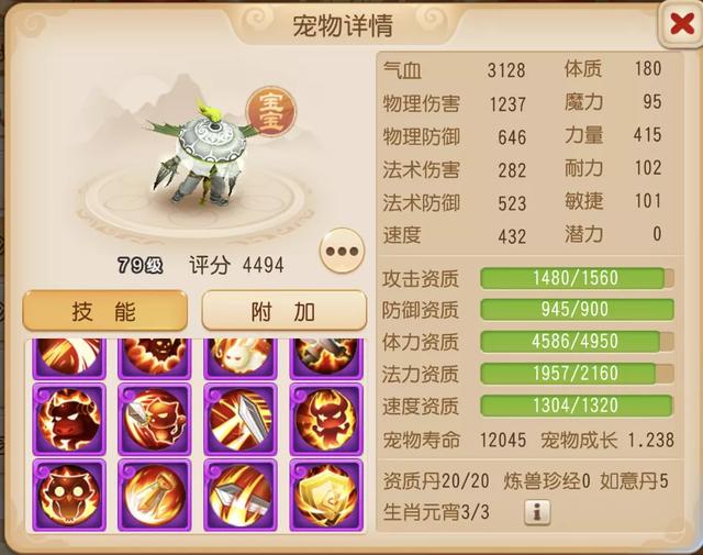 资质上其实很OK,防御接近满,体力资质4351,攻击资质1449,虽然成长低了些,只有1.136,但是从整体来看,这个宠物也已经非常优秀了。