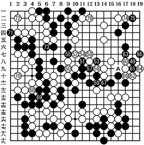 虽说是白棋优势,但是差距并不大。比如说黑右边的49,从棋型来看是最容易想到的手段,但是此时在白60位碰是好手,如果白棋A位连回的话,黑棋可以从61位扳粘。只要下出这个手段,那么这盘棋的局面就总算是回到了均势状态。