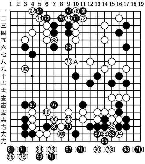 然后上方开始形成了结城,黑101消劫,而白100安定了下方之后,白102开始选择打入,这盘棋的走势也就此发生了变化。