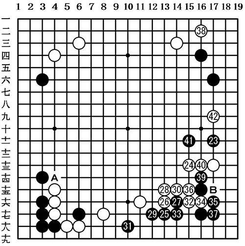 为了让黑31派上用处,需要考虑右下角的白棋,黑39防止了白B的断,然后选择了黑41,看上去还是很有魄力。