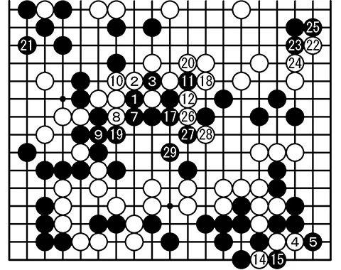 大矢浩一表示:“白24之后,很想从黑1开始动手开劫。行至白20是一般的(6、13、16拔劫)。然后黑21吃掉左边,白22开始行至白28吃掉右边的黑棋形成转换。这个转换之后感觉是黑棋不错”。