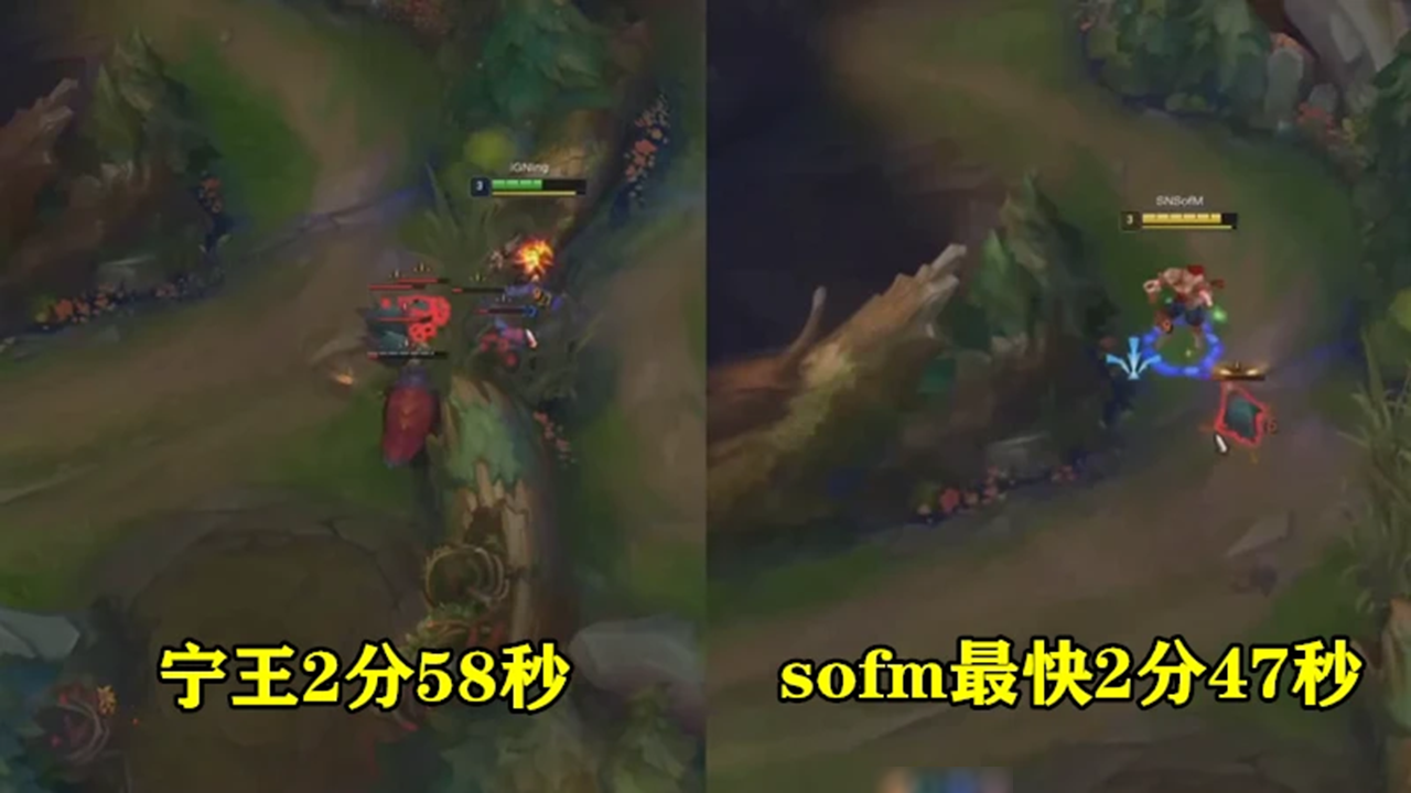 有网友把宁王和SN打野Sofm两人的刷野路线进行了对比后,最终发现Sofm不仅比宁王快了十一秒,并且还省了一个惩戒,这对于一个打野来说,将会直接影响到他们在对决前期的节奏。毕竟在职业赛场上,每一秒、每一个技能都非常的关键,而打野选手能够尽早的刷完野升到三级,也就意味着他们能够更快的去到线上GANK,当然IG的失利并不仅仅是这一个问题,但是这一个问题却非常的致命,因为这可以直接凸显出一个打野的基本功如何。