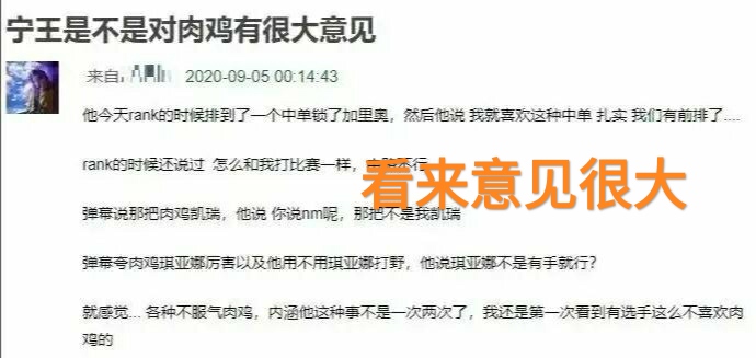 冒泡赛被lgd战队击败之后,ig战队也是彻底结束了s10赛季,这也是这两年以来他们首次无缘世界总决赛,对于一个曾经的王者,就让他打击是非常大的,这两天ig战队的众多选手都在直播,而打野选手宁王也是直面观众的质疑,在一局非常普通的韩服排位中,队友直接秒锁了中单加里奥,宁王就表示自己就非常喜欢这种中单,扎实有前排就非常放心,之后怒怼弹幕也是一直在内涵rookie非常的菜。