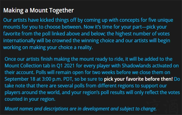 一旦我们的设计师完成了该坐骑的制作,它就会被添加到2021年第一季度的游戏中,每个拥有暗影国度资料片的玩家的坐骑收藏之中,投票共两周,一定要在结束之前选出喜欢的,请注意,我们的最终结果会统计所有地区的投票,所以可能实际与您所在地区的投票排名有差异。