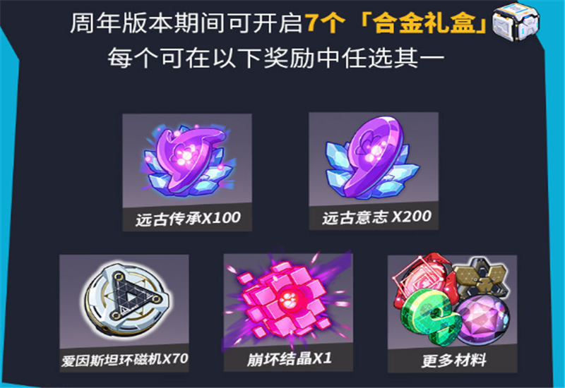 此外还有合金礼盒,这里给的材料有远古传承、远古意志,属于角色碎片的兑换材料,环磁机是超限武器的必备道具,都是属于比较珍稀的资源类。