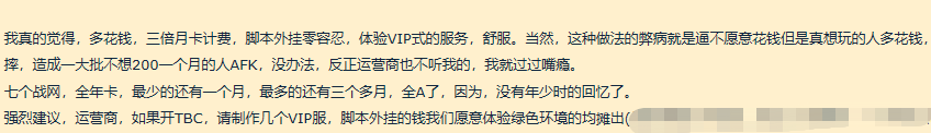 这位玩家认为目前怀旧服之所以工作室这么多,主要原因还是暴雪力度不够,因为对于暴雪来说,工作室的账号和玩家的账号都能提供营收,那么为什么要费那么大力气管这些能给自己交钱的账号呢?于是这位玩家提议,能不能开通一个VIP服务器,每个月月卡价格翻三倍,但是官方保证这个服务器里不能有工作室和脚本。