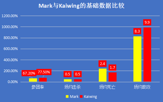 从上图两人对比数据来看,Kaiwing在参团率、场均死亡和场均助攻上均占据优势,在场均击杀与Mark持平。受限于赛区实力上的不同,数据虽不能精准反映两人之间的实力差距,但也能从一定程度上反映出双方各自的长短处。所以,如果单凭数据说话,那么无疑Kaiwing占优,但要综合起来看,双方最次也是持平,就我个人而言,Mark还更优一些。
