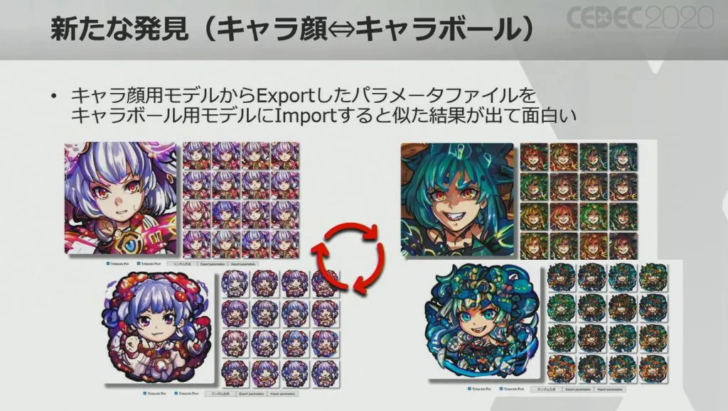 这个系统制作出来是为了满足角色的脸和弹珠两个需求的,长舩先生也展示了将生成角色的参数原样输入生成弹珠用的系统中就生成了和这个角色相似的弹珠的结果。虽然看起来理所当然,但学习角色的脸和弹珠的数据应该有所差异。
