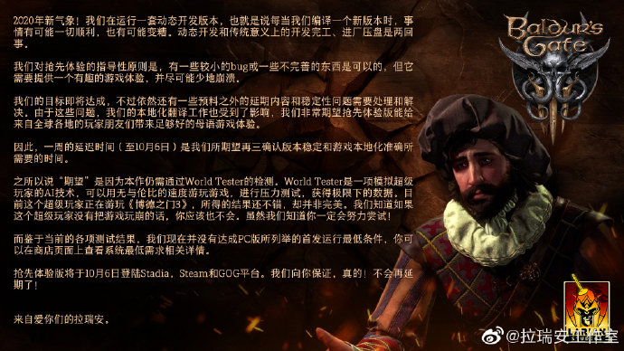 《博德之门3》抢先体验版宣布跳票一周此前拉瑞安工作室曾宣布,《博德之门3》会在8月开启抢先体验,不过后来游戏跳票了。官方又宣布将于9月30日开启抢先体验,眼看就没几天了,玩家们终于等到头了。但昨晚官方推特…