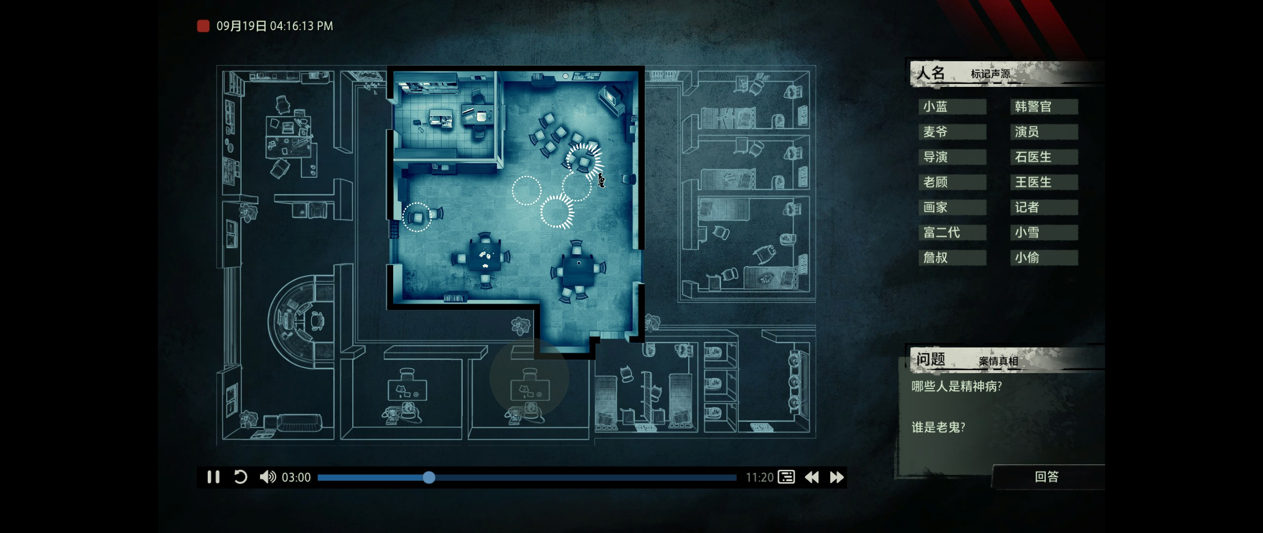 随后虽然游戏主打的是疑案追声,但在玩家操控角色窃听众人的谈话时,还是不可避免的能得到另一个信息,那就是在什么什么时间,什么地点,那个角色和那个角色见面了,这一点就很BUG了。常看推理系列内容的玩家都知道一个词叫做作案时间,玩家可以通过这个方式来了解到谁有作案的能力,谁没有作案的能力,再加上设计者只赋予了玩家声音的信息,难度设定偏低,就导致了玩家开始推理之前就先PASS一部分人。